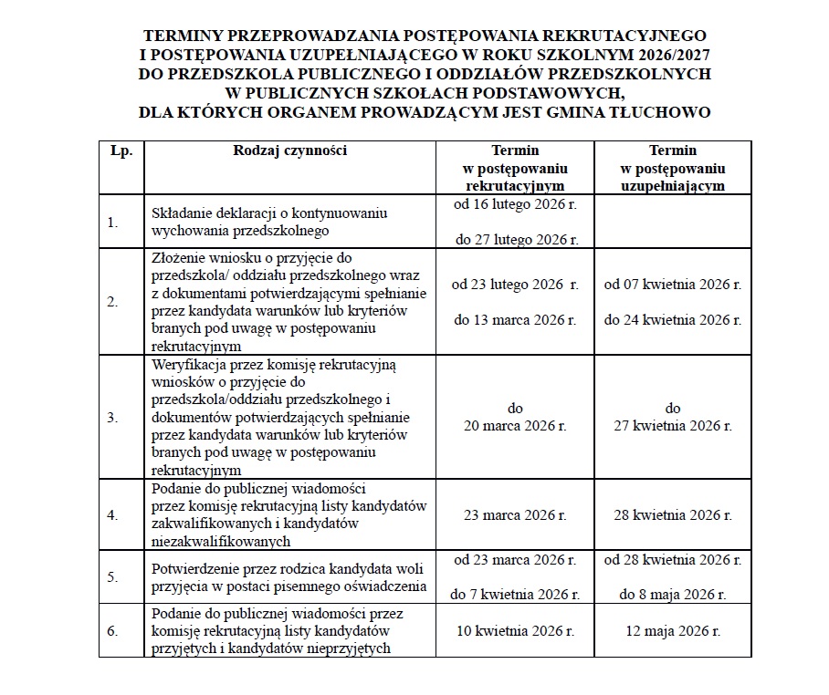 Terminy przeprowadzania postępowania rekrutacyjnego i postępowania uzupełniającego oraz terminy składania dokumentów do przedszkola publicznego i oddziałów przedszkolnych w publicznych szkołach podstawowych określone zostały przez organ prowadzący w Załączniku Nr 1 do Zarządzenia Nr 0050.11.2026 Wójta Gminy Tłuchowo z dnia 26 stycznia 2026 r. w sprawie ustalenia terminów przeprowadzania postępowania rekrutacyjnego i postępowania uzupełniającego do przedszkola publicznego i oddziałów przedszkolnych w publicznych szkołach podstawowych, klas pierwszych publicznych szkół podstawowych dla których organem prowadzącym jest Gmina Tłuchowo na rok szkolny 2026/2027.