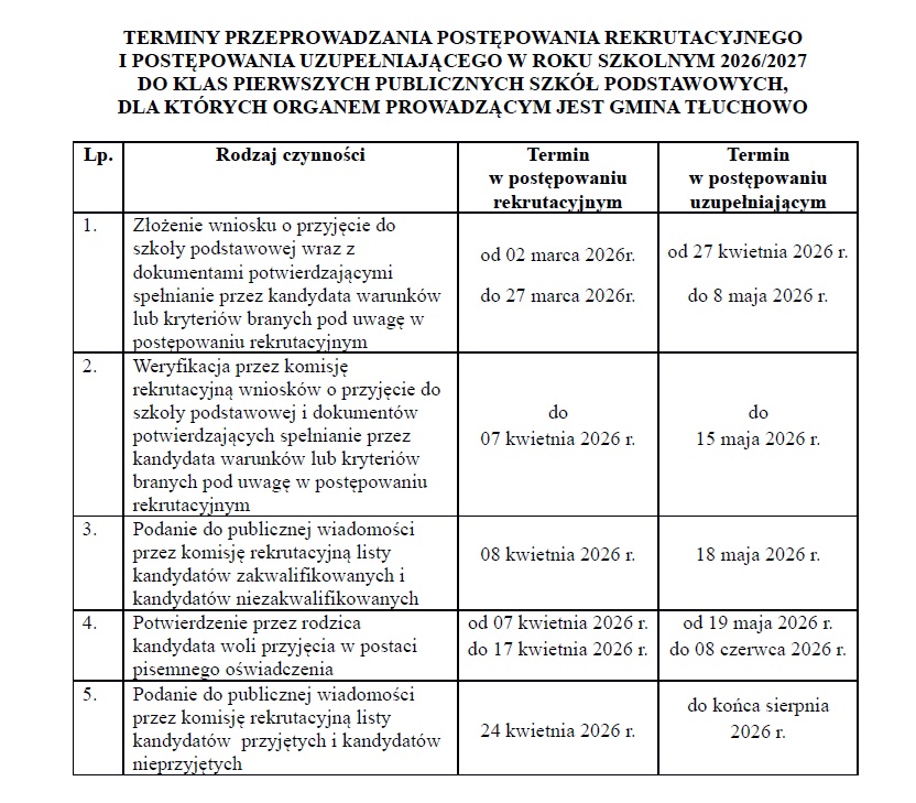 Terminy przeprowadzania postępowania rekrutacyjnego i postępowania uzupełniającego oraz terminy składania dokumentów do klas pierwszych w szkołach podstawowych określone zostały przez organ prowadzący w Załączniku nr 2 do Zarządzenia Nr 0050.11.2026 Wójta Gminy Tłuchowo z dnia 26 stycznia 2026 r. w sprawie ustalenia terminów przeprowadzania postępowania rekrutacyjnego i postępowania uzupełniającego do przedszkola publicznego i oddziałów przedszkolnych w publicznych szkołach podstawowych, klas pierwszych publicznych szkół podstawowych dla których organem prowadzącym jest Gmina Tłuchowo na rok szkolny 2026/2027.
