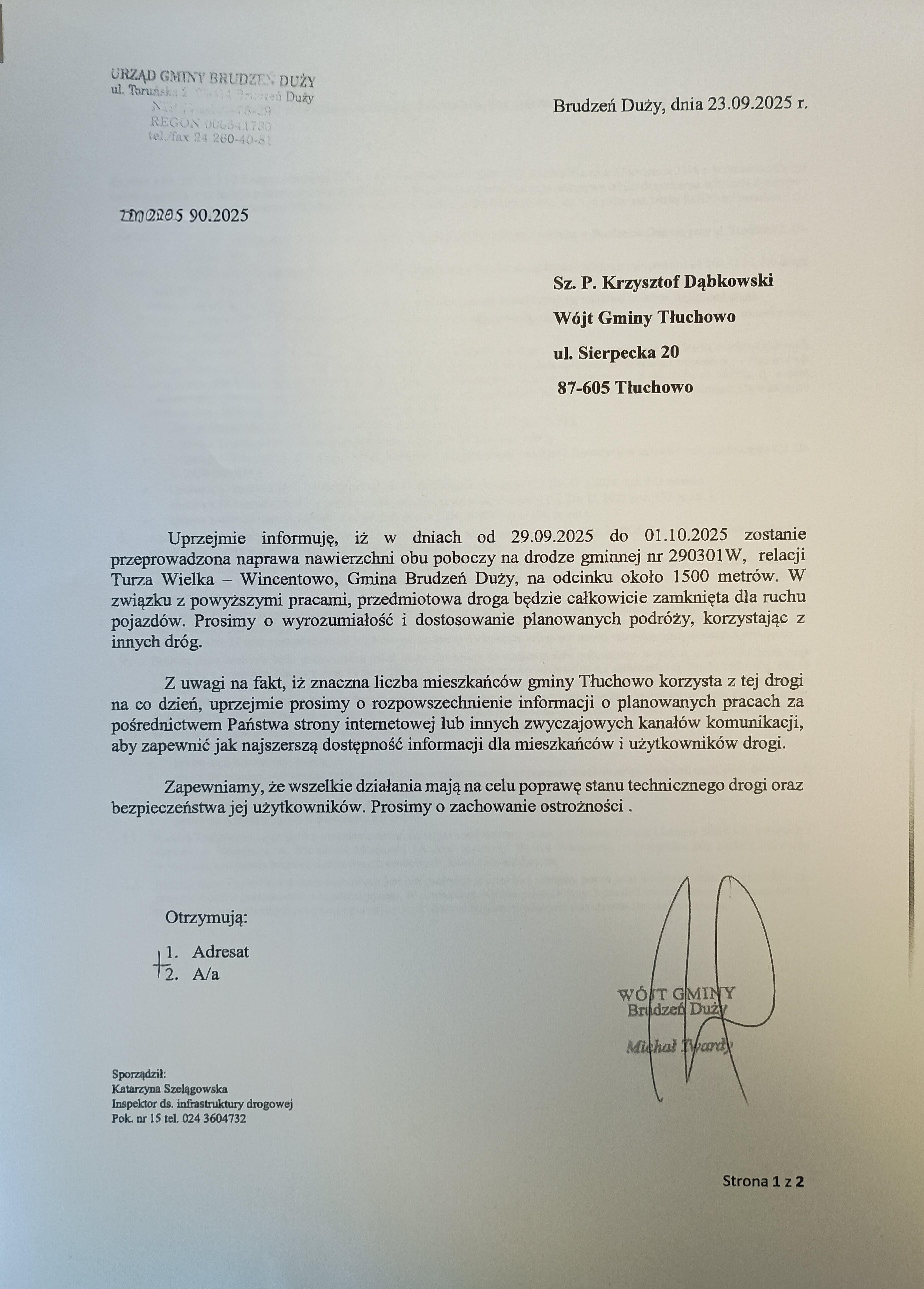 Planowane roboty drogowe na trasie Turza Wielka - Wincentowo